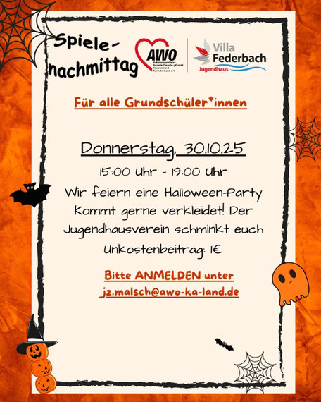 Anmeldungen bei uns im Jugendhaus vor Ort oder unter jz.malsch@awo-ka-land.de